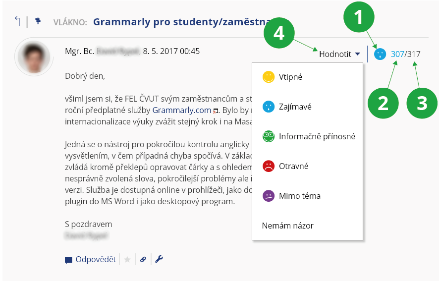 - 5.Jak mohu hodnotit příspěvky?V rámci každého příspěvku lze vpravo nahoře vybrat nejvhodnější hodnocení příspěvku a přispět tak k lepší orientaci v příspěvcích pro ostatní čtenáře. Celkové skóre, počet hodnocení a převládající hodnocení se okamžitě přepočítají (v horní liště hodnoceného příspěvku).