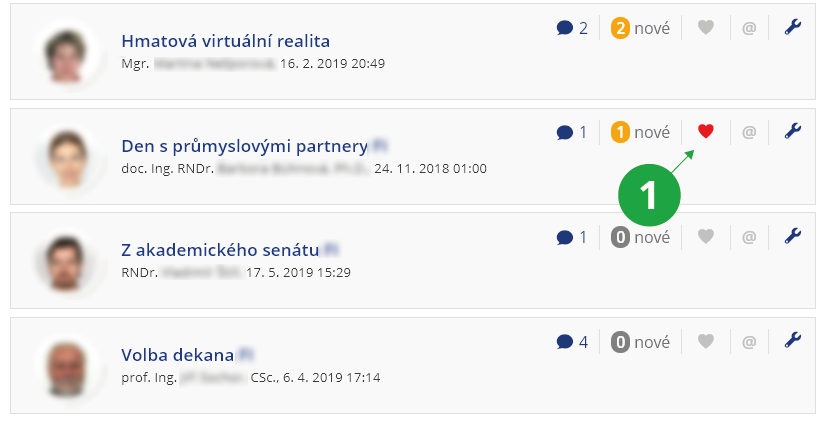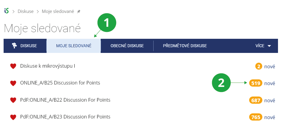 Informační systém Diskuse Moje sledované1 Sekce „Moje sledované“ obsahuje přehled všech fór, která jsou označena ikonou srdce.