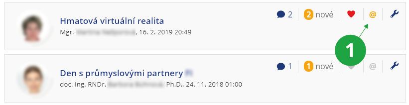 Podrobnější nastavení zasílání e-mailu (zda bude stručné, úplné či v jakém intervalu) lze zvolit v aplikaci Události:1 Ikonou zavináče zapínáte či vypínáte odběr příspěvků e-mailem.