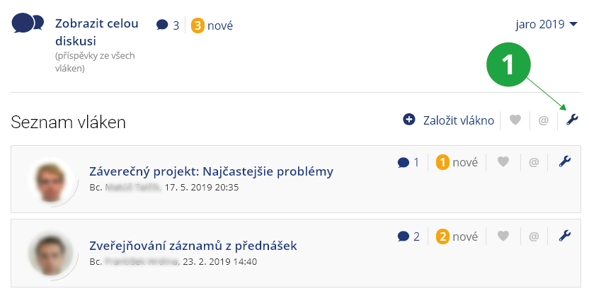1 V menu pod ikonou montážního klíče naleznete možnost, jak studentům vnutit konkrétní tematické předmětové diskusní fórum.