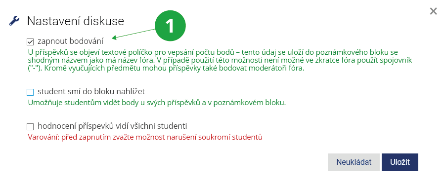 Objeví se nastavení možnosti bodování a můžete bodování zapnout. Pod každým příspěvkem se potom bude všem vyučujícím předmětu zobrazovat textové pole pro hodnocení. Tento údaj se uloží do poznámkového bloku se shodným názvem jako má název fóra. Studenti tento poznámkový blok a hodnocení nevidí. Pokud jim chcete tuto zpětnou vazbu zpřístupnit, zvolte „student smí do bloku nahlížet“.1 Pod ikonou montážního klíče nahoře u seznamu vláken najdete nastavení celé předmětové diskuse.