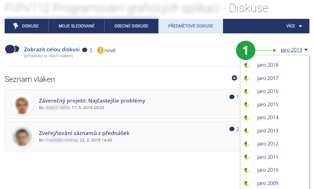 semestru?V předmětovém diskusním fóru zapsaného předmětu si můžete přepínat semestry, ve kterých se daný předmět vypisoval, a dostat se tak i k diskusím ze starších období.